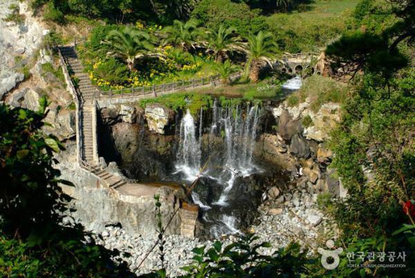 울창한 난대림지대 사이로 3단 폭포가 떨어지는 모습은 실로 장관인데 제1폭포에서 떨어져 수심 21m의 못을 이루고, 이 물은 다시 제2폭포, 제3폭포를 거쳐 바다로 흘러 들어갑니다.